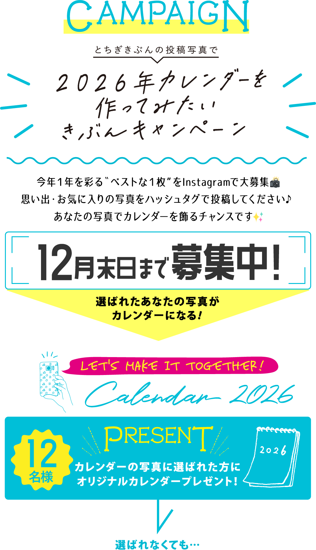 とちぎきぶんキャンペーン(以下「本キャンペーン」という)への応募については、本規約を必ずお読みください。なお、とちぎきぶん「@tochigi_kibun」をフォローいただき、ハッシュタグ「#とちぎきぶん」及び各月固定のハッシュタグをつけて応募された場合には、本規約に同意したものとみなします。