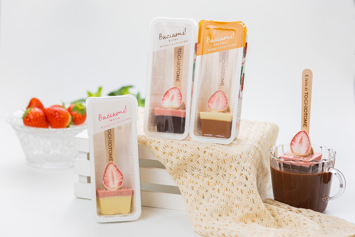 中身が見えるパッケージには、栃木県産「とちおとめ」の断面がアクセントに。