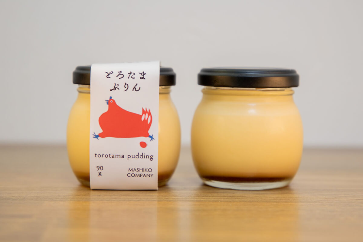 ころんと丸いフォルムの赤いニワトリのイラストと、やさしい手書き文字の「とろたま ぷりん」。