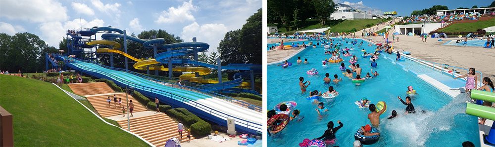 2本立てのウォータースライダーや1周400mもある流れるプール、波のプールは大人気!