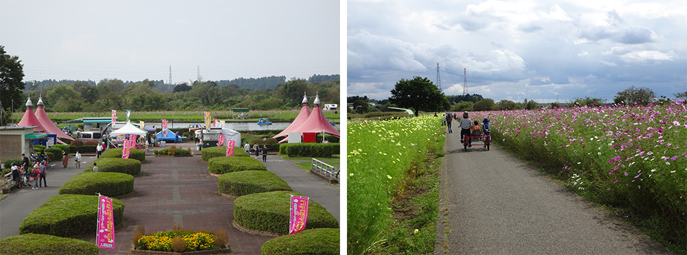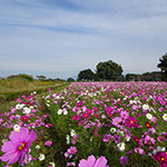 鬼怒グリーンパーク(高根沢町)では、10月上旬から2.2haの花畑に約120万本のコスモスが咲き誇ります。赤、白、黄色の花が一面に咲く景観は見応えがあります。