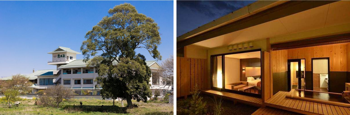 檜露天風呂、広々とした内風呂、さらに、露天風呂付客室もあり、併設している日帰り温泉館「太陽の湯」が無料で利用できる人気のお宿です。