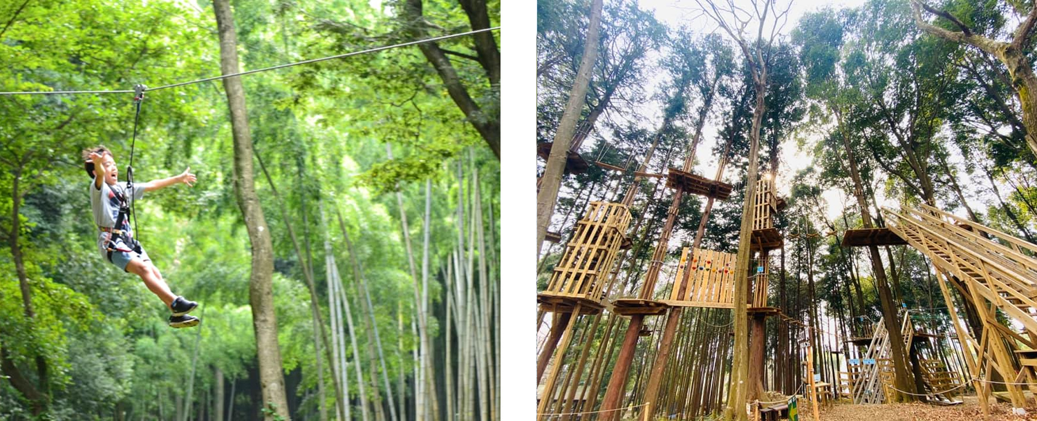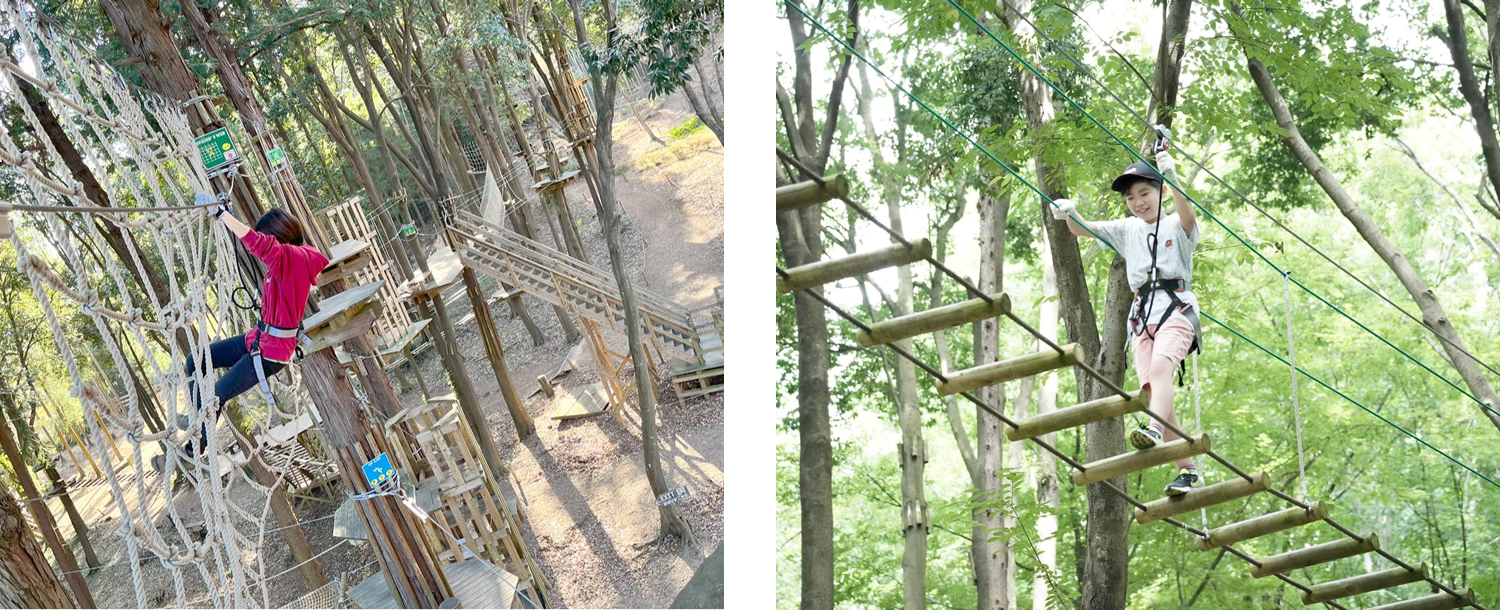 森の木々を渡り歩いたり、ジップスライドで滑空したり、