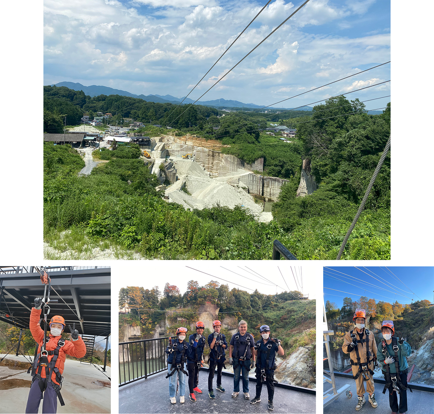 採石場の約200メートル間にワイヤロープが張られ、スタート地点から標高差約20メートルを滑車で滑り降りるスリル満点の空中散歩。