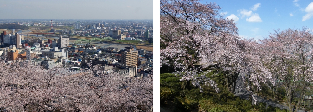 織姫公園の山頂からは、満開の桜越しに足利市内を一望できます。