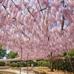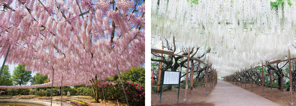 樹齢160年におよぶ600畳敷きの藤棚を持つ大藤や、長さ80mもの白藤のトンネルなど350本以上の藤が咲き誇ります。