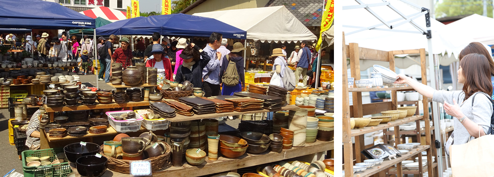 また、焼物だけでなく地元農産物や特産品も 販売されるなど賑わう陶器市。好きな作家さんの作品や新たな発掘をしに行きませんか?